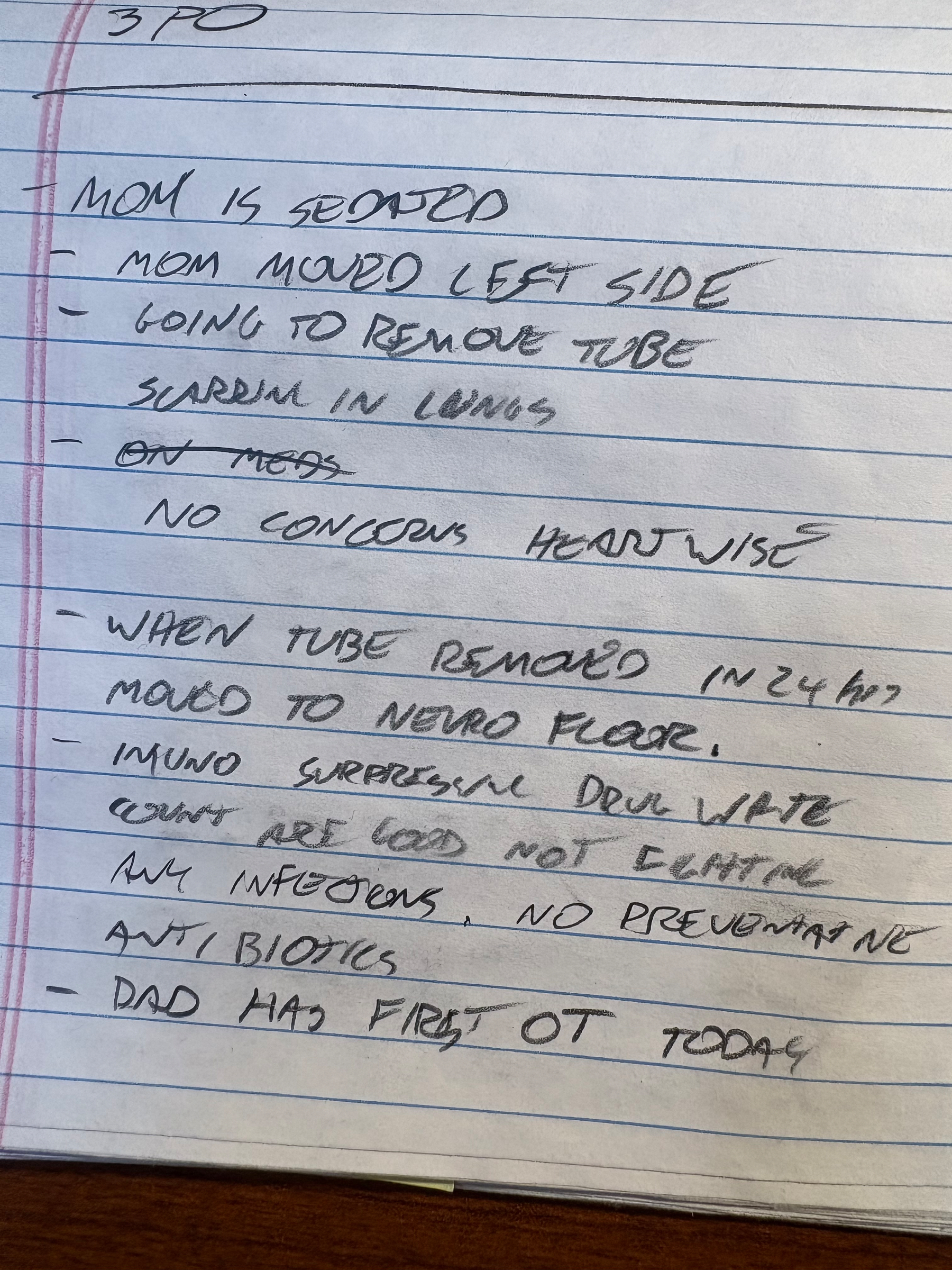 Today, 3/2/2026, would be my mom’s 88th birthday. Unfortunately, she had a stroke last year on February 19th and passed away peacefully on 5/30/2026. While cleaning up my desk on Friday, I found this scratch pad on my desk and closed it to find notes I scribbled while talking with Liz from the ICU shortly following the stroke. I am grateful that, for the majority of my mom’s last 100 days, she was a short walk from home, and I could visit 24 hrs a day, multiple times a day.